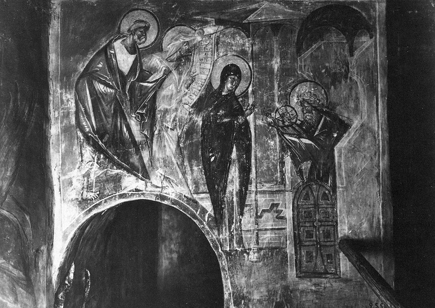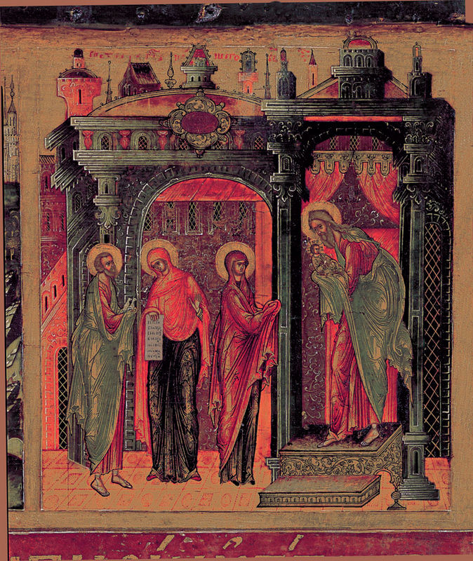 Мы видим в храме Пречистую Деву, держащую на руках Богомладенца. А праведный Иосиф Обручник стоит с двумя горлицами. По Закону Моисееву полагалось приношение в жертву агнца. Но, согласно книге Левит, бедные, не имеющие агнца, – самые бедные из бедных – должны были приносить двух горлиц или двух птенцов голубиных. Горлица – жертвенное создание. Когда ее приносят в жертву, она смиренно склоняет шею и не издает ни единого стона. Две горлицы – потому что одна должна была быть принесена во всесожжение, а другая – во оставление грехов. Это совершенно необыкновенное знамение. Святые отцы говорят, что две горлицы символизируют два Завета: Ветхий и Новый, и событие Сретения Господня является носителем обоих.